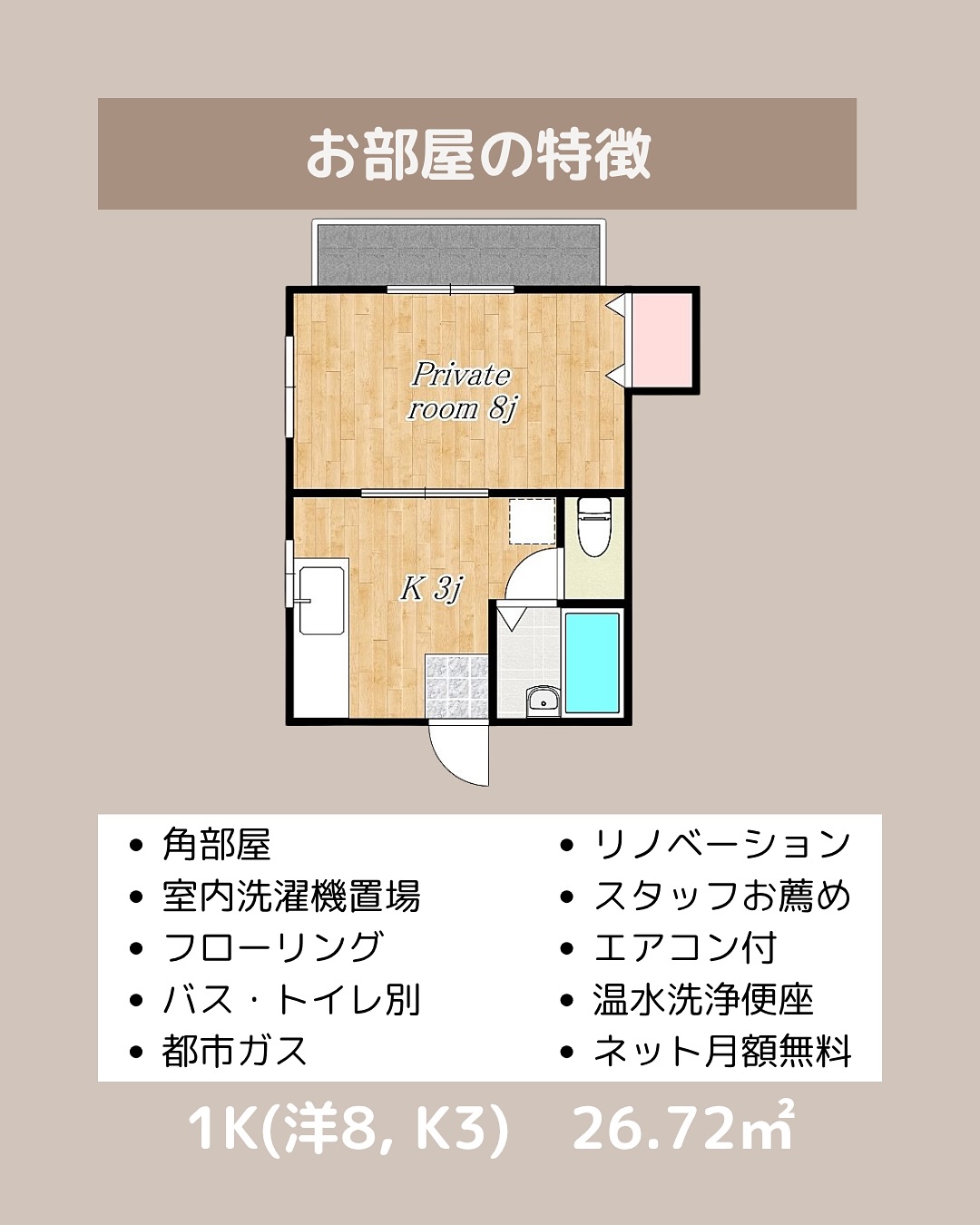 🛏間取り:1K(洋室8帖+K3帖)