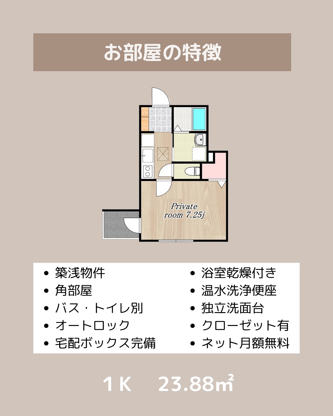 1K|洋室7.2帖+キッチン3帖(計23.88㎡)